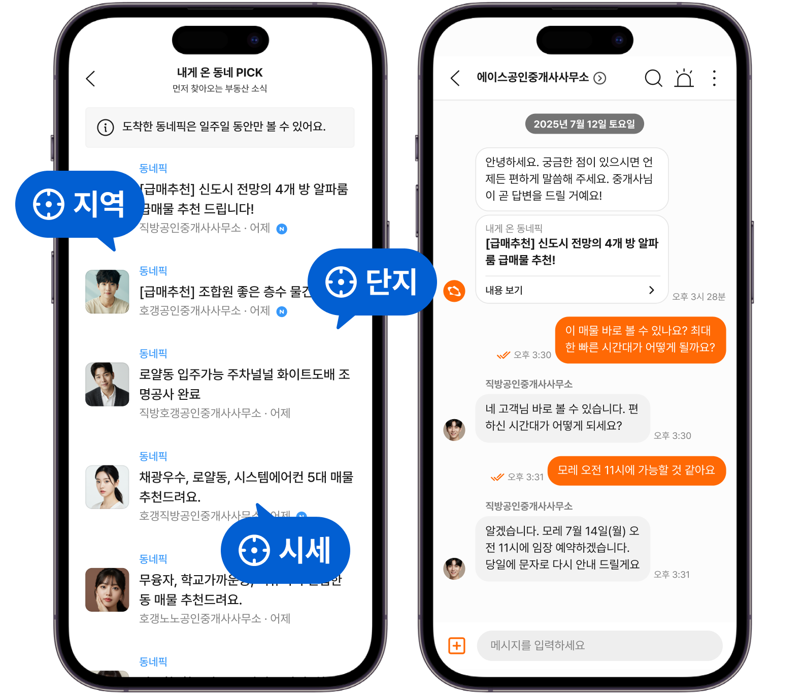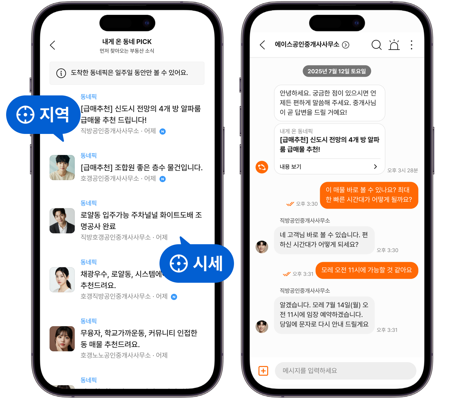 특정 지역과 매물 시세에 관심이 있는 고객에게 부동산 정보가 노출되고, 정보를 본 고객으로부터 더 많은 문의를 받을 수 있어요.